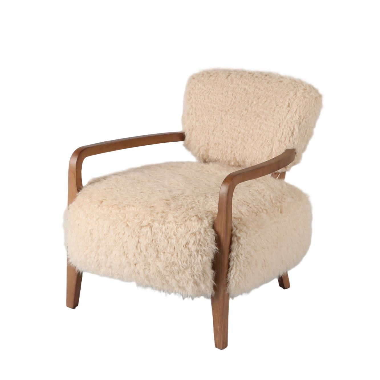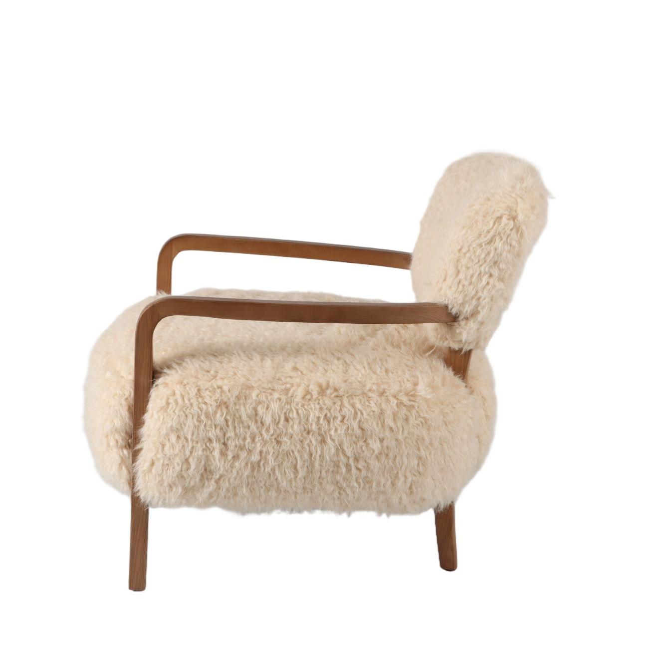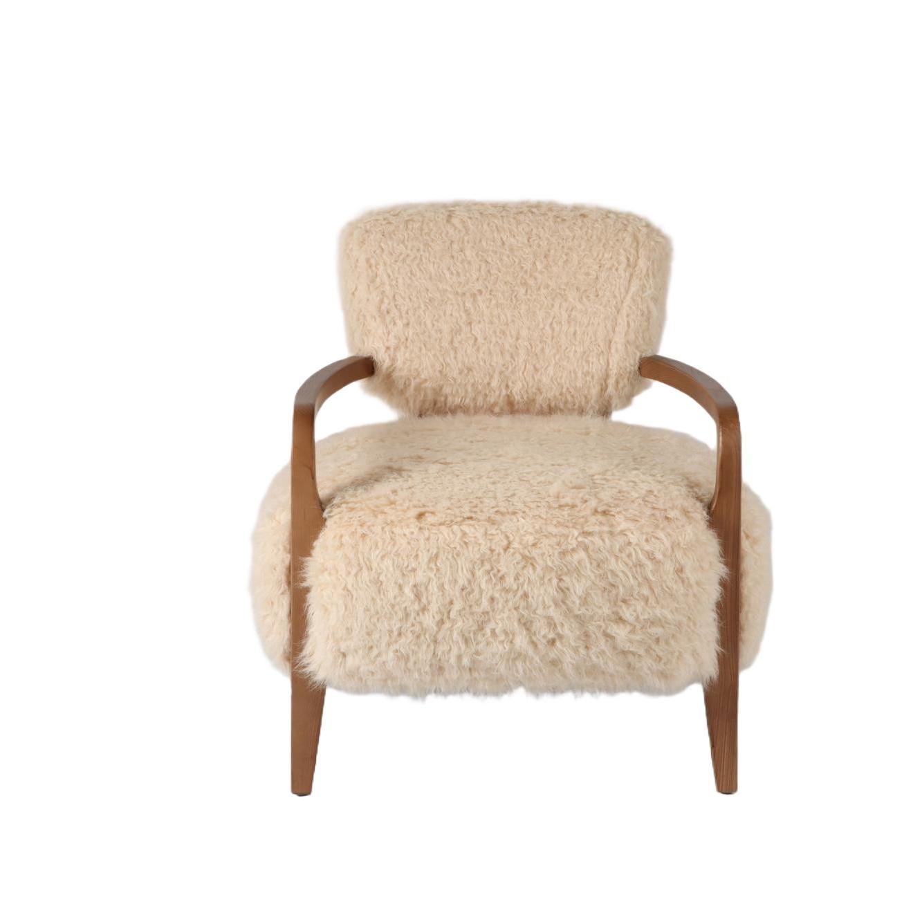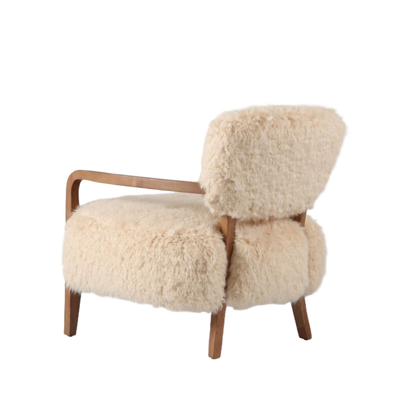 Wrapped in sumptuous vegan sheepskin upholstery, this armchair offers an indulgent seating experience. The natural texture and softness of the sheepskin create a sense of warmth and luxury, making it the perfect spot to curl up and relax. The generous cushioning and supportive foam padding provide optimal comfort, while the sturdy wooden frame ensures durability and stability.