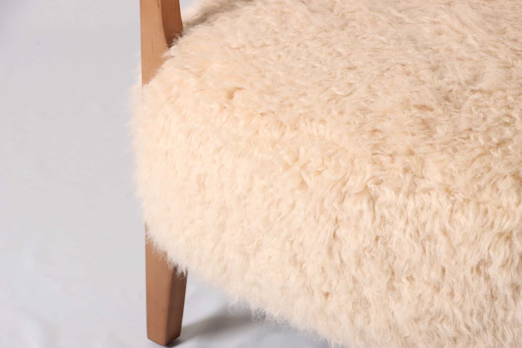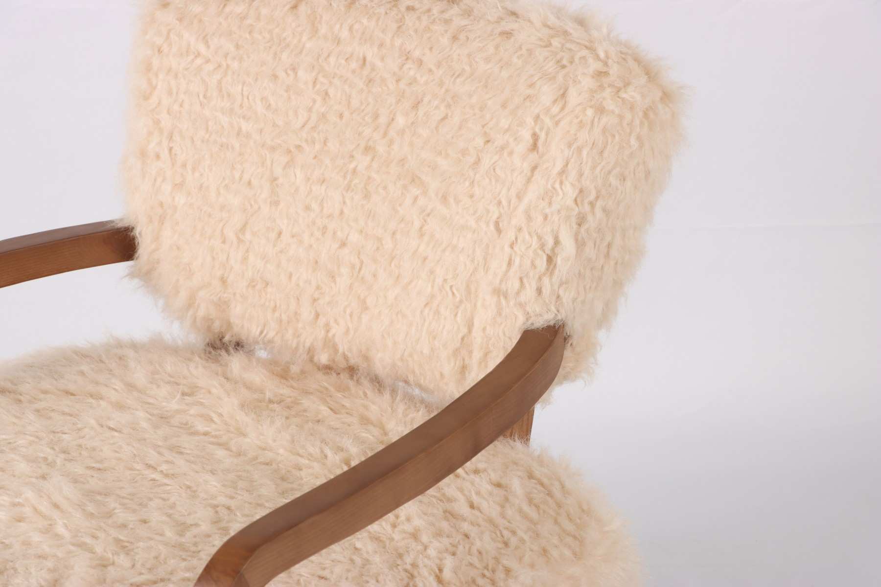 Wrapped in sumptuous vegan sheepskin upholstery, this armchair offers an indulgent seating experience. The natural texture and softness of the sheepskin create a sense of warmth and luxury, making it the perfect spot to curl up and relax. The generous cushioning and supportive foam padding provide optimal comfort, while the sturdy wooden frame ensures durability and stability.